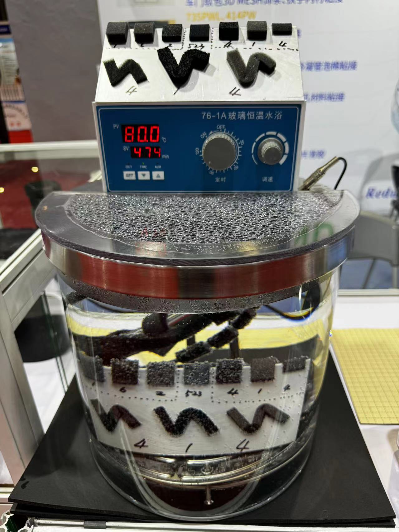 其實以上展示都還是開胃菜,現場最吸睛的莫過于這個熱水煮背膠海綿,路過我們展臺的觀眾無不駐足觀看,并用手摸一摸玻璃水浴。看到我們是貨真價實的展示,客人對我們產品的稱贊不絕于耳。