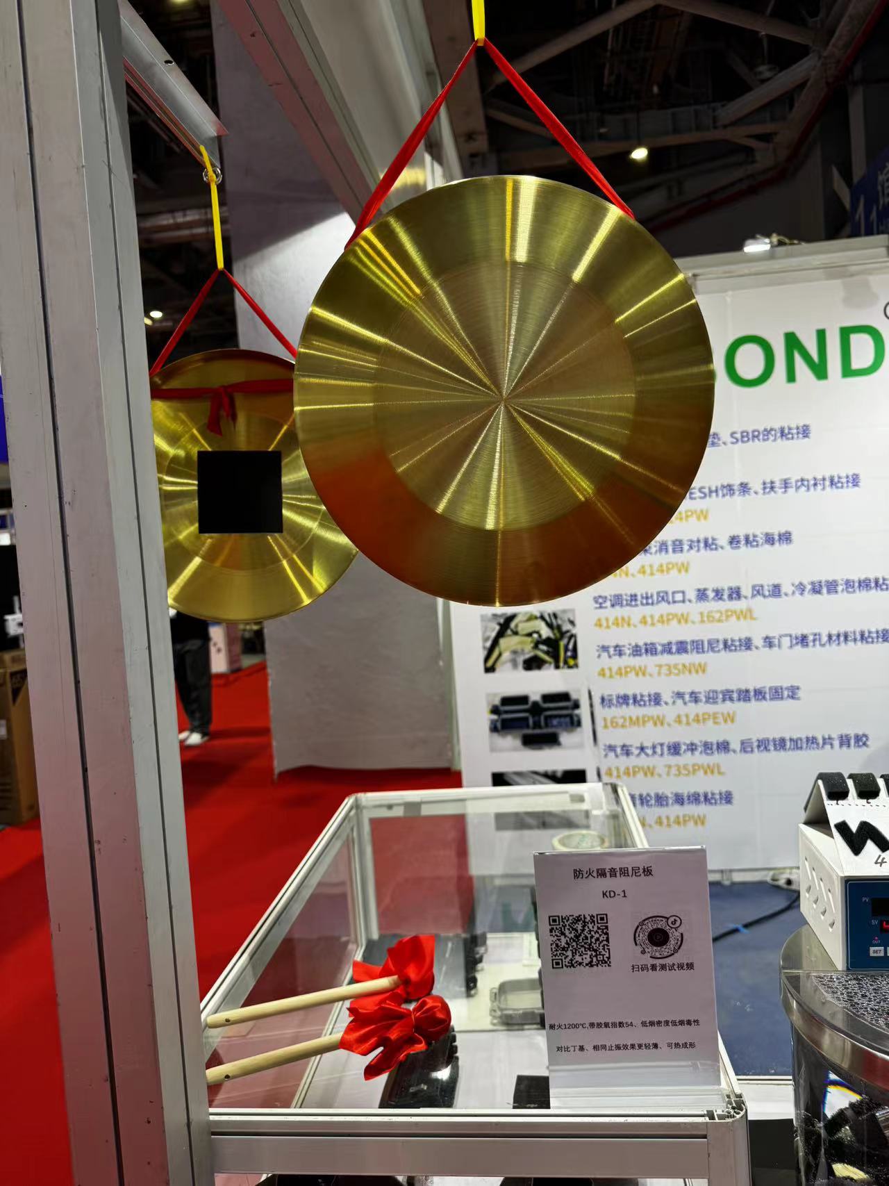 展會上也展示了我們強大的EVA阻尼片——KD-1的止振性能?,F場懸掛的兩只銅鑼,一只貼了1.5*120*120mm的KD-1阻尼,一只什么也不粘貼。通過鼓槌敲擊,貼KD-1阻尼的銅鑼聲音沉悶并且迅速消音,未貼阻尼的銅鑼聲音洪亮,能持續(xù)半分鐘。眾所周知聲音是由振動產生的,只要能消除振動就能消除聲音,1.5mm厚度的KD-1消聲效果完全超越了同等尺寸、更厚的丁基阻尼!并且不帶膠氧指數達到72、帶膠氧指數達到54;還擁有低煙毒性、低煙密度;1200℃火焰槍噴燒1分鐘也不會產生滴落物及被火焰穿透。所有客戶都表示,如此優(yōu)秀的產品,KD-1它配得上它的價格!