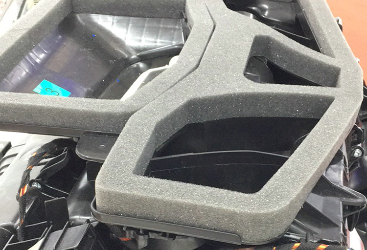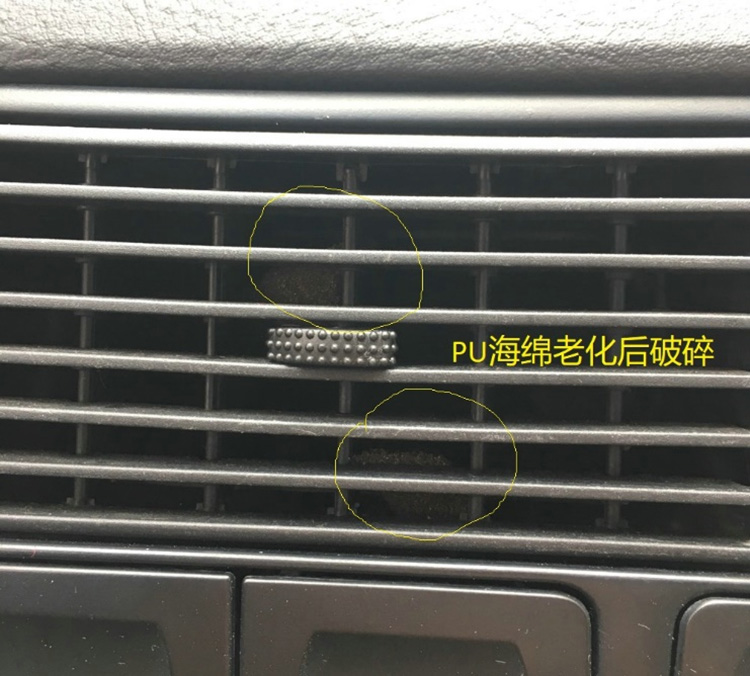 汽車空調(diào)出風(fēng)口和汽車空調(diào)管道接駁處需要用到密封海綿(圖一),其功能主要是密封減震、保溫、止水止氣。該海綿墊圈部分截?cái)嗝娣e直接和汽車空調(diào)向車艙輸送的壓縮空氣接觸,因此其本身的環(huán)保特性如VOC、氣味、霧化等也會(huì)影響流向車艙空氣的VOC含量及乘客嗅味感受,甚至擋風(fēng)玻璃的霧度。其成本在汽車空調(diào)總成件中微不足道,但其重要性卻不可小覷。