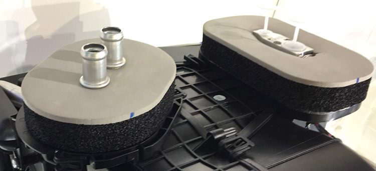空調(diào)出風(fēng)口背膠海綿,其主要構(gòu)成是發(fā)泡海綿和壓敏膠帶的復(fù)合品。汽車空調(diào)廠家根據(jù)組裝工藝要求,常選用的海綿材質(zhì)為PU聚氨酯發(fā)泡海綿(全開孔,圖二)和EPDM三元乙丙發(fā)泡海綿(半開孔半閉孔,圖三),近年來也有廠家選用多種復(fù)合材質(zhì),如EPDM海綿和IXPE電子交聯(lián)海綿的復(fù)合品(圖四)。