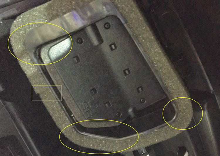 無論采用何種海綿,都需要用到壓敏膠來實(shí)現(xiàn)海綿和出風(fēng)口粘接的目的,而一款性能優(yōu)異的壓敏膠帶務(wù)必需要同時(shí)滿足以下幾點(diǎn):①優(yōu)異的持久粘接力,這是保證海綿圈長期服貼性的基礎(chǔ);②優(yōu)異的長期耐高低溫、耐濕度范圍;③曲面抗蠕變能力,對非DIECUTTING沖型的整塊海綿而是由密封條折彎而成的風(fēng)口海綿顯得尤為重要(圖六、圖七);④符合低VOC低氣味的環(huán)保要求;⑤優(yōu)異的性價(jià)比。