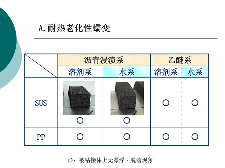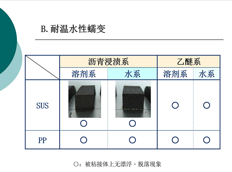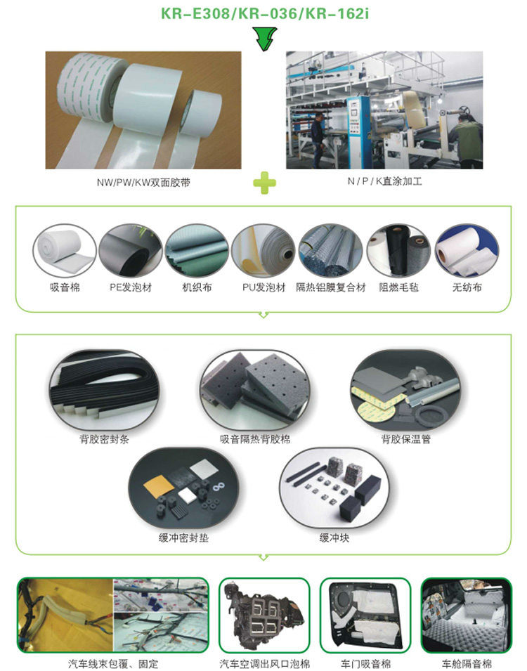 日本光洋產(chǎn)業(yè)株式會(huì)社根據(jù)該空調(diào)海綿圈的應(yīng)用要求,于2015年7月成功推出了一款改良的水性丙烯酸壓敏膠KR-162i。其與PU海綿和EPDM海綿優(yōu)異的持久粘接性能,優(yōu)異的耐高低溫(-40℃-100℃)、耐水性,優(yōu)異的曲面粘接耐翹曲性能,優(yōu)異的環(huán)保性能,較高的性價(jià)比,使其一經(jīng)推出就深受汽車行業(yè)模切加工企業(yè)的追捧。